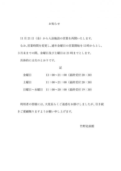 平素より竹野北前館「誕生の湯」をご利用いただき誠にありがとうございます。10月9日に天井裏に設置してある排気ダクトに落下の危険が発見され、営業を休止していましたが、この度その落下防止措置が完了しましたので、入浴施設の営業を11月21日(金)から再開させていただきます。なお、本格的なダクトの改修につきましては、引き続き、検討してまいります。