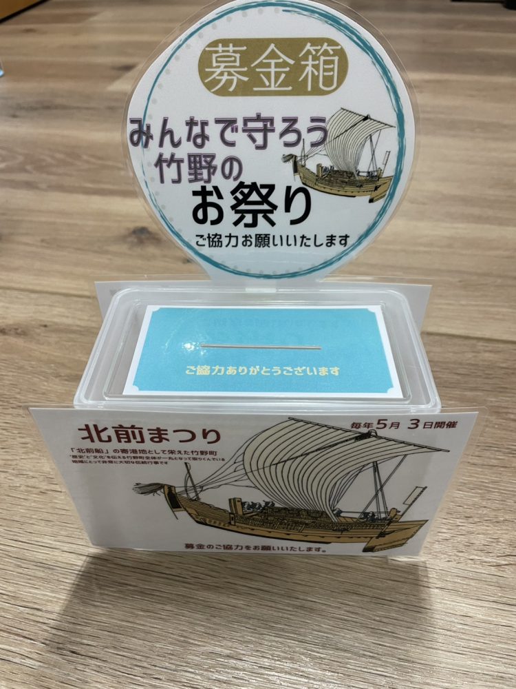 現在、町内のお宿(民宿・旅館・ホテル)および各種団体様にご協力をいただき、募金箱を設置し、北前まつり継続のためのご支援をお願いしております。